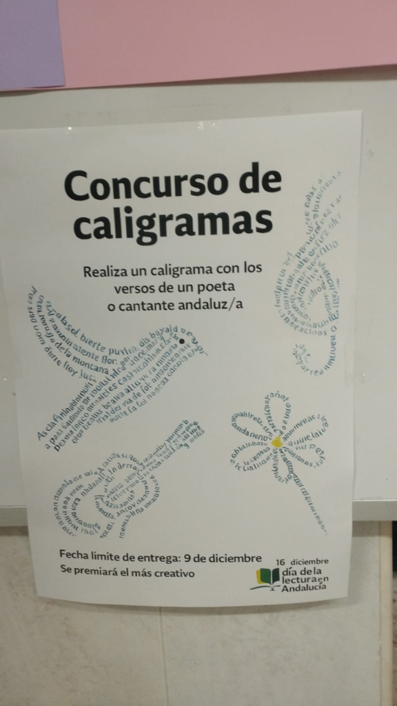 Con motivo del DÍA DE LA LECTURA EN ANDALUCÍA, celebrado este 16 de diciembre, el alumnado del IES SAGRADO CORAZÓN ha realizado caligramas con las letras de poemas y canciones de artistas y poetas andaluces. ¿Os gusta el resultado?